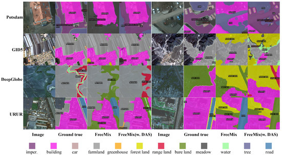 When using supervised pretraining on ImageNet1K to initialize the image encoder and fine-tune it on the GPDU dataset, we observe a degradation in performance. However, with our RS_SSL initialization method and freezing the image encoder during training, the model can extract domain-agnostic universal features, thereby accelerating decoder optimization and improving learning efficiency. Furthermore, incorporating the ESB branch to construct a dual-branch network further enhances performance. The ESB effectively extracts entity masks and captures accurate semantic features for classification, contributing significantly to better segmentation results. Additionally, employing DAS improves overall performance, especially on datasets with relatively small amounts of data. For instance, on the Potsdam dataset, mIoU increased from 19.98% to 47.03%, demonstrating substantial improvement. Even on larger datasets like URUR, there was an increase in mIoU from 29.30% to 35.72%. The above findings indicate that our proposed methods—RS_SSL initialization, ESB, and DAS—are highly effective in enhancing the performance of FreeMix. The qualitative results of FreeMix are visualized in Figure 5, providing a clear demonstration of its superior performance in semantic-segmentation tasks.