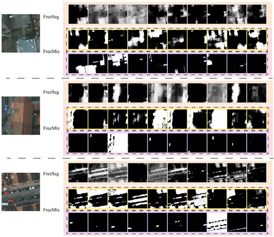 In this section, we conduct ablation studies on our FreeMix using the joint GPDU dataset. All experiments utilize a ResNet50 backbone and the CLIP-B/16 VLM, with FreeSeg serving as our baseline for comparison. Table 5 summarizes the effectiveness of three key components: the proposed initialization method with self-supervised learning in remote sensing (RS_SSL), the entity segmentation branch (ESB) and the dataset-aware sampling (DAS) training tactic. These results clearly indicate that each proposed component consistently enhances the overall performance of FreeMix, highlighting their individual and combined contributions to improved semantic-segmentation outcomes. Using RS_SSL initialization provides a substantial improvement over the baseline, indicating the value of leveraging self-supervised learning specifically tailored for remote-sensing tasks. The introduction of ESB yields consistent performance boosts across all datasets, suggesting its critical role in capturing more accurate and detailed entity representations. DAS not only elevates mIoU and mACC but also demonstrates its ability to balance performance across diverse datasets, thereby ensuring robust generalization.