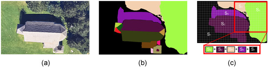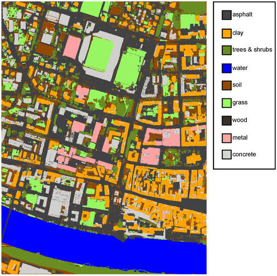 Next, contextual filtering is applied to further refine the segmentation, targeting small nonstatic objects (e.g., cars) that can negatively impact broadband albedo estimation for a given location. For this purpose, a cDSM raster image D is used. Each pixel in the cDSM contains information on the aboveground height and a basic classification into one of the three categories considered: building, ground, or vegetation. Other more precise object classes are not considered in this paper. A cDSM can be straightforwardly constructed from a classified LiDAR point cloud, where 3D points are classified into the three basic classes using a state-of-the-art semantic segmentation approach, such as PointNet++ [43] and the point transformer model [44]. However, some points may remain unclassified and are treated as noise, representing small objects such as cars. Each given segment is checked if it satisfies the condition of having more than of its pixels classified as ground within D and having an area smaller than m2, where the following criterion is applied: