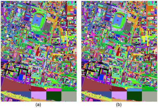 Zero-shot segmentation of the true orthophoto using the SAM method by considering the VIS and NIR bands, (a) before applying cDSM-based filtering and (b) after application.