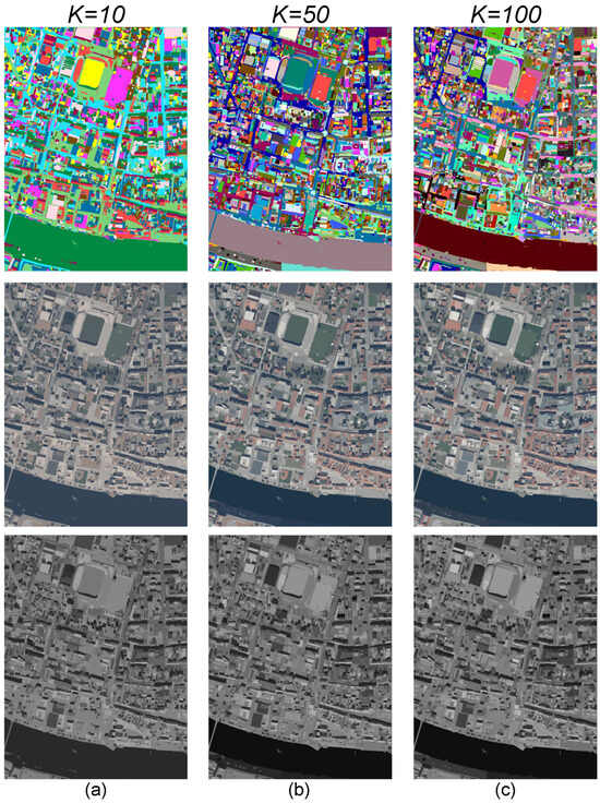 Application of K-means over SAM segmentation over high-resolution orthophoto for (a) , (b) , and (c), . Pixels colored by segments’ feature vectors for VIS and NIR bands are shown below in the second and third row, respectively.