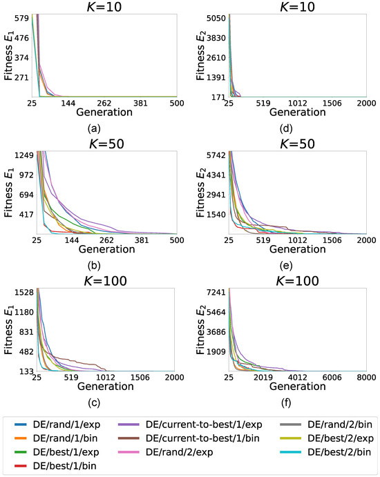 Results of the proposed method when considering different DE strategies for (a,d), (b,e), and (c,f), when minimizing (first column) or (second column) objective functions.