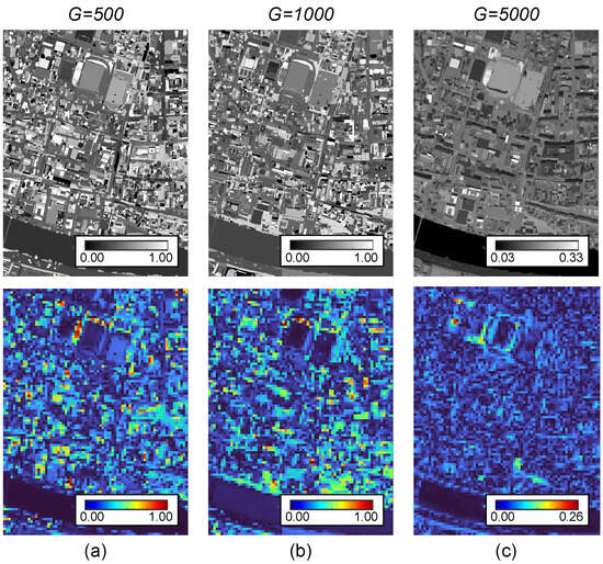 where [, ] is the manually defined albedo range for the j-th pixel. It should be noted that this validation was performed using estimated albedo values at the original resolution of 1 m, that is, (see Equation (16)).