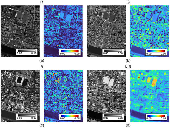 Spatial–spectral analysis of downscaled albedo for each per-band contribution from the true orthophoto, as well as the estimated per-pixel absolute differences, namely for (a) R, (b), G, (c), B, and (d) NIR bands.