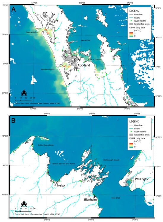 - Gall, M.P.; Pinkerton, M.H.; Steinmetz, T.; Wood, S. Satellite remote sensing of coastal water quality in New Zealand. N. Z. J. Mar. Freshw. Res. 2022, 56, 585–616. [Google Scholar] [CrossRef]
