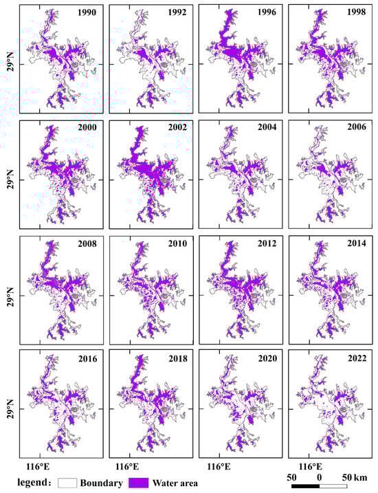 The remote sensing results revealed the water area dynamics of Poyang Lake during the wet and dry seasons from 1990 to 2022. To more clearly illustrate the spatial distribution, the results are displayed biennially in Figure 2 and Figure 3. Spatially, the water area of Poyang Lake wetland showed a continuous surface distribution during the wet season, with minimal annual changes in the main lake area and significant variations in sub-lake areas, especially in the Nanji wetland (Figure 2 and Figure 3). During the dry season, the spatial distribution of the water area exhibited pronounced year-to-year changes in the main lake, displaying nearly linear patterns in 1992, 2006, 2020, and 2022. Sub-lake areas around the main lake maintained patchy surface distributions, with southern and eastern sub-lakes showing limited annual variation.