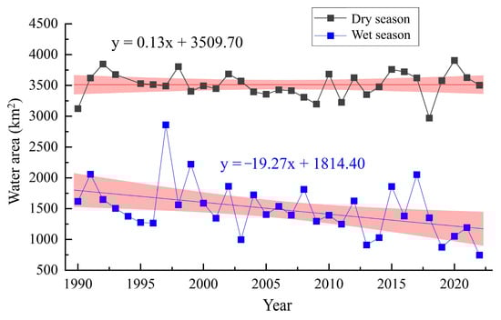 The interannual trend of the water area of Poyang Lake during the wet and dry seasons from 1990 to 2022 is shown in Figure 4. The overall change in the water area during the wet season was not significant, with a growth rate of 0.13 km2/a, an average area of 3511.79 km2, with the minimum value appearing in 2018 at 2971.20 km2, and the maximum value appearing in the typical flood year 2020 at 3905.14 km2 (Figure 4). During the dry season from 1990 to 2022, the water area showed a fluctuating downward trend (19.27 km2/a), peaking at 2861.37 km2 in 1997 and reaching a historic low of 745.63 km2 in the 2022 drought.