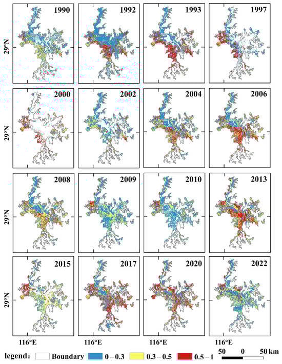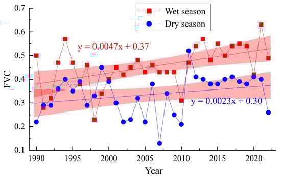 The calculation results of the FVC of Poyang Lake wetland from 1990 to 2022 are shown in Figure 5, Figure 6 and Figure 7. To more clearly illustrate the spatial distribution, results with distinct spatial features are selected in Figure 5 and Figure 6. High FVC areas (FVC > 0.5) are mainly distributed in the periphery of Poyang Lake during the wet season. As water levels decline in the dry season, vegetation growable areas expand, but high FVC zones remain peripheral, while low FVC areas (FVC < 0.3) dominate the central lake region. The FVC exhibited a fluctuating upward trend during the wet season (growth rate: 0.0047/a), with a mean value of 0.45, peaking at 0.63 in 2021 and reaching a minimum of 0.23 in 1998. A similar trend occurred in the dry season (growth rate: 0.0023/a), with a mean of 0.34, a maximum of 0.52 in 2011, and a minimum of 0.13 in 2007. Spatially, the vegetation growth of Poyang Lake gradually deteriorated from the edge of the lake to the lake area, and the average value was about 32.35% higher in the wet season than in the dry season.