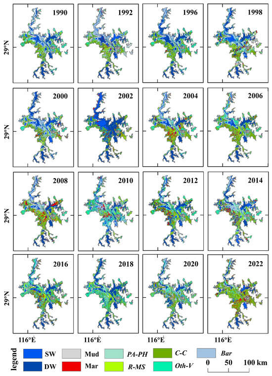 In this paper, the land use types in the Poyang Lake wetland from 1990 to 2022 were classified using the RFSC method. The resultant ACC coefficient and Kappa coefficient were both greater than 0.84. To more clearly illustrate the spatial distribution, the results are presented at different yearly intervals in Figure 8. Spatially, the shallow water area is mainly located in the larger sub-lakes and the peripheral areas of the main lakes, which are frequently connected to the deep-water area. The deep-water area is mainly located in the through-river lake zone. Bare ground is predominantly found in seasonally dry lakes and sub-lakes surrounding the water bodies. Mudflats are mainly found in the Gisan and Songmen Mountain areas. Marshland is predominantly distributed in Nanji wetland (southwestern Poyang Lake), characterized by its proximity to surrounding sub-lakes. The C. cinerascens community is predominantly distributed in the southwestern lake region. The P. arundinacea–P. hydropiper community mainly clusters near the waterside. The reeds–M. sacchariflorus community is mainly distributed in the lake area connected with the C. cinerascens community. Other vegetation types exhibit scattered distribution, concentrated near Xiushui and Lianhua Township.