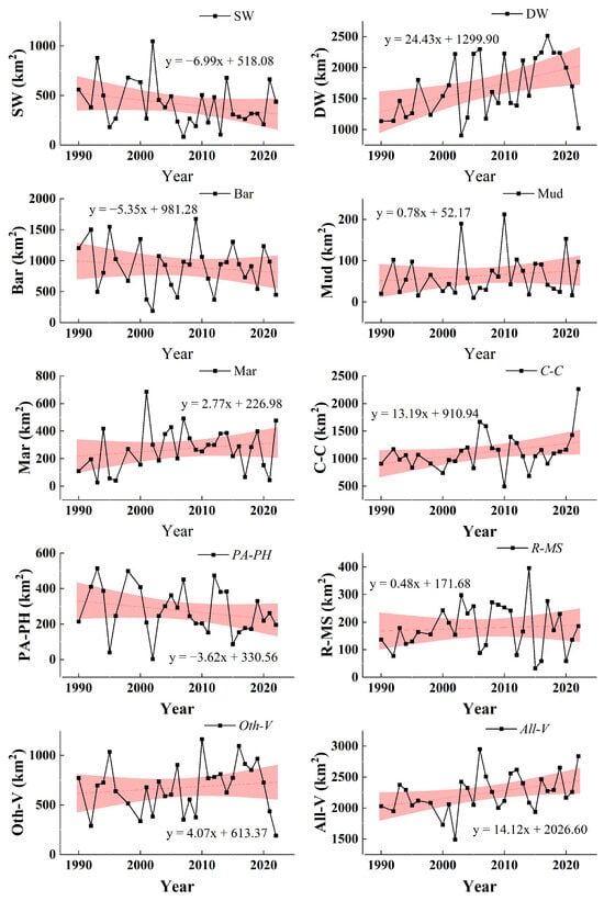 From 1990 to 2022, shallow water areas exhibited a downward trend, declining at 6.99 km2/a, with an average area of 409.77 km2. The deep-water area demonstrated fluctuating inter-annual increases, growing at 24.43 km2/a, averaging 1678.57 km2 annually. Bare ground area decreased at 5.35 km2/a, with an 898.32 km2 average. Mudflats, accounting for the smallest proportion, maintained relative stability despite two notable fluctuations in 2003 and 2010, averaging 64.29 km2. Marshland showed subtle inter-annual growth at 2.77 km2/a, averaging 269.97 km2. The C. cinerascens community area inter-annual change showed a fluctuating upward trend, rate was 13.19 km2/a, averaging 1115.41 km2. The P. arundinacea–P. hydropiper community showed a fluctuating downward trend, the rate of decline was 3.62 km2/a, and the fluctuation amplitude was gradually reduced, averaging 274.37 km2. The reeds-M. sacchariflorus community interannual change is relatively smooth, averaging 179.16 km2. The other vegetation showed a fluctuating trend of increase, the rate of increase was 4.07 km2/a, averaging 676.42 km2. The total area of Poyang Lake wetland vegetation showed a fluctuating growth trend, the rate of increase was 14.12 km2/a, averaging 2245.37 km2 (Figure 10).
