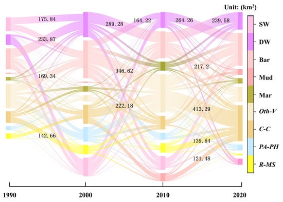 From 1990 to 2000, the change in land use types in Poyang Lake was predominantly characterized by the conversion of shallow water and bare ground to deep water (409.71 km2/a), combined with the conversion of other vegetation to bare ground (169.34 km2), C. cinerascens community to reeds–M. sacchariflorus community (142.66 km2), as shown in Figure 11. From 2000 to 2010, the transition dynamics shifted toward the conversion of bare ground to other vegetation (346.62 km2) and deep water (164.22 km2), while 289.28 km2 of deep water was reverted to bare ground, alongside 222.18 km2 of C. cinerascens community was converted to other vegetation (Figure 11). During the period from 2010 to 2020, the dominant processes involved the conversion of other vegetation to C. cinerascens community (413.29 km2) and bare ground (217.20 km2), with additional contributions from reeds–M. sacchariflorus community and mudflats converted to C. cinerascens community by 139.64 km2 and 121.48 km2, respectively (Figure 11). Interconversion also occurred between bare ground and deep water (239.58 km2 bare ground to deep water, 264.26 km2 deep water to bare ground). The area of shallow water being transformed decreased significantly and the area of C. cinerascens community being transformed increased significantly over time (Figure 11). Overall, the changes in land use types in Poyang Lake from 1990 to 2020 were mainly dominated by the conversion of shallow water to deep water and bare ground, other vegetation to C. cinerascens community and bare ground, bare ground to deep water, and reeds–M. sacchariflorus community to C. cinerascens community.