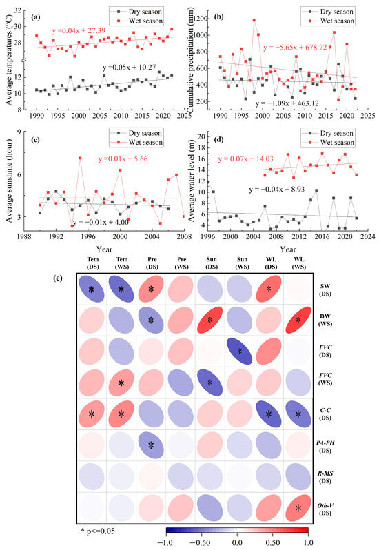 Interannual variation of (a–d) meteorological and hydrological data, and (e) Pearson correlation analysis (DS: dry season, WS: wet season, Tem: average temperatures, Pre: accumulated precipitation, Sun: average sunshine duration, WL: average water level, others same as in Figure 8).