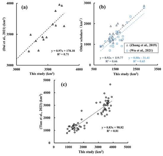 Although the study area assessed based on remote sensing technology is wider, ground verification of results remains challenging. The results of this study were compared with the data from existing studies, including water area data for Poyang Lake from Dai et al. (2021) during the wet season from 2006 to 2019 [53], Zhang et al. (2019) during the dry season from 1996 to 2016 [54], Wu et al. (2021) during the dry season from 1996 to 2016 [55], and Tian et al. (2023) during the wet and dry seasons from 1990 to 2021 [48]. The study was validated across wet and dry seasons, as well as their combined periods. From Figure 13, the simulation results of this study are closely aligned in magnitude and temporal trends with those of previous scholars, with a strong fitting performance (R2 ≥ 0.65). However, the discrepancies may arise from methodological variations, data selection criteria, and boundary delineation approaches.