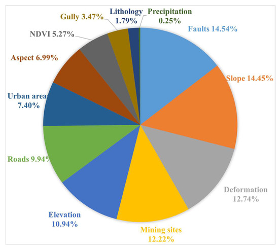 where is the optimized factor quantification value, D is the actual Euclidean distance from the pixel to the fault, valley, building, road, or mining site, and is the maximum influence distance of the fault, valley, building, road, or mining site. is the geological and geomorphological unit of the pixel (faults and mining sites do not consider the geological and geomorphological unit), and is the geological and geomorphological unit of the valley, building, or road, where indicates that the pixel is not in the same geological and geomorphological unit as the valley, building, or road. For faults, based on the study by Guo et al. [27], is set to 20 km, meaning that points more than 20 km away from the fault are not considered in the fault factor. For valleys, is 5 km, and the pixel must be located in the watershed of the valley. For buildings, is 2 km, and the pixel must be on the same slope as the building. For roads, is 5 km, and the pixel must be on the same slope as the road. For mining sites, is 10 km.
