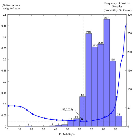 When the prediction probability threshold traverses the entire probability range, the sequence of the weighted sum of JS divergences for all influencing factors, denoted as is obtained. Finally, the prediction probability threshold , which corresponds to the minimum value of , is taken as the threshold for dividing landslide-prone points from non-landslide-prone points.