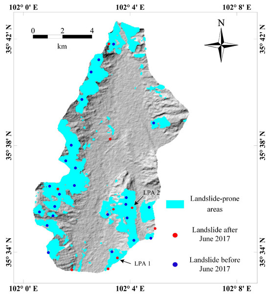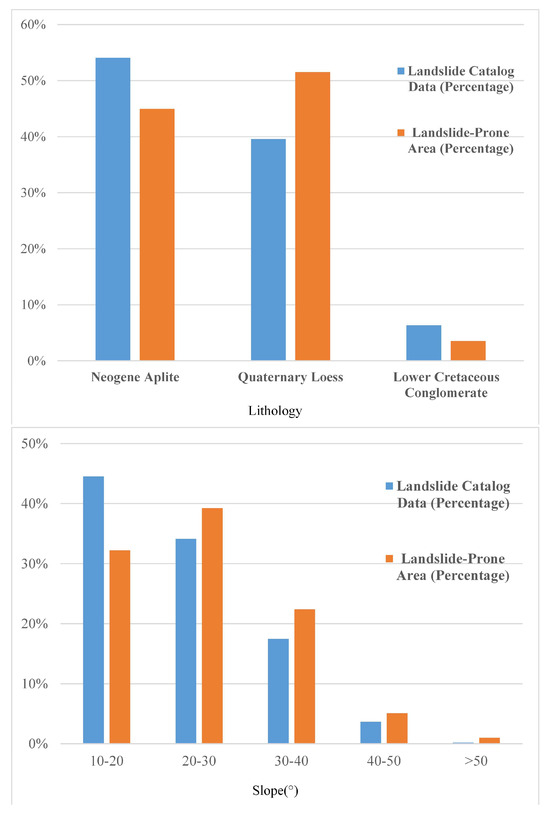 To further demonstrate the validity and accuracy of the identified landslide-prone areas, two examples (LPA1 and LPA2) of landslide-prone areas where landslides occurred after June 2017 are shown in Figure 10. These areas are displayed based on changes observed in Google Earth images before and after June 2017. From Figure 10, it can be seen that the mountain in LPA1 experienced multiple landslides after June 2017, while LPA2 saw a large-scale landslide across the entire mountain. The landslide body, boundaries, rear edge, and walls of the landslides are all clearly visible. The landslide activities in LPA1 and LPA2 are closely related to regional geological structures. The study area is located near the Longwu River fault zone (Figure 3), where fault activity has fractured the bedrock, reducing the slope’s shear strength [24]. Both LPA1 and LPA2 are located in the deformation uplift zone to the east of the Longwu River, where, although the deformation magnitude is not large, the area remains unstable under the influence of geological activities, human activities, and other factors. With a fault distance of less than 3 km and a high slope greater than 25°, multiple landslides occurred between June 2017 and August 2019. Moreover, in LPA2, the landslide material is mainly fine-grained rock, and the proximity to faults and mining sites, along with intense geological and anthropogenic activity, makes it more prone to collapses or slides in the fractured rock masses. Additionally, as shown in Figure 11, comparing the lithology and slope dimensions reveals that the correspondence between the landslide catalog data and the landslide-prone area is quite close, further demonstrating that the characteristics of the landslide-prone areas identified by this method are consistent with historical landslides.