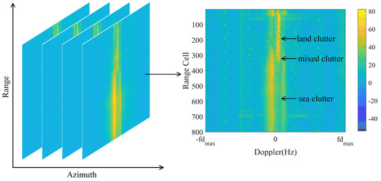 Sea clutter is generated by the interaction between radar signals and ocean waves. The first-order Bragg peak observed in sea clutter arises from the interaction between the high-frequency electromagnetic waves transmitted by OTHR and the Bragg resonance scattering caused by ocean waves [17]. Generally, sea clutter exhibits a symmetrical dual peak around the 0 Hz frequency in an RD map, as shown in Figure 2. Land clutter is generated by the interaction between radar signals and the ground. The relative change in speed of ground targets is relatively small, often manifesting as low-speed signals, so the spectrum of land clutter is usually more stable [17]. Ideally, land clutter exhibits a single peak around the 0 Hz frequency in an RD map, as shown in Figure 2. Generally, mixed clutter occurs near the coastline, where the radar signals interact with both ocean waves and the ground [17]. Therefore, mixed clutter has the characteristics of both sea clutter and land clutter, as shown in Figure 2. When the ionosphere is stable, the amplitude of land clutter exceeds that of sea clutter due to the higher scattering coefficient of terrestrial surfaces compared to that of maritime surfaces, as shown in Figure 2. Human experts leverage these characteristics when classifying sea–land clutter data. Consequently, the features of sea–land clutter around the 0 Hz frequency play a crucial role in SLCC.