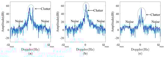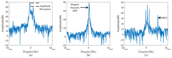 Examples of clutter in an RD map. (a) Sea clutter with amplitude fluctuations. (b) Land clutter with Doppler frequency shifts. (c) Mixed clutter with NRFI.