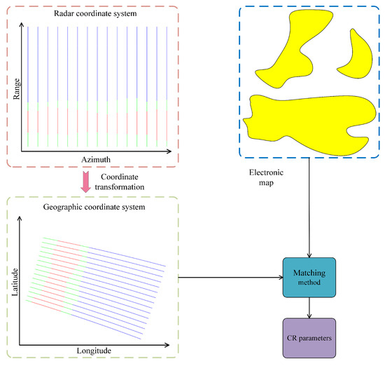 The CR parameters are crucial for target positioning with OTHR, which can improve the positioning accuracy. An SLCC-based CR method is the process of matching the SLCC results with an electronic map. Generally, the process of CR is divided into two steps: (1) converting the SLCC results from the radar coordinate system into the geographic coordinate system and (2) mapping the SLCC results onto the electronic map and finding the best-matching results.