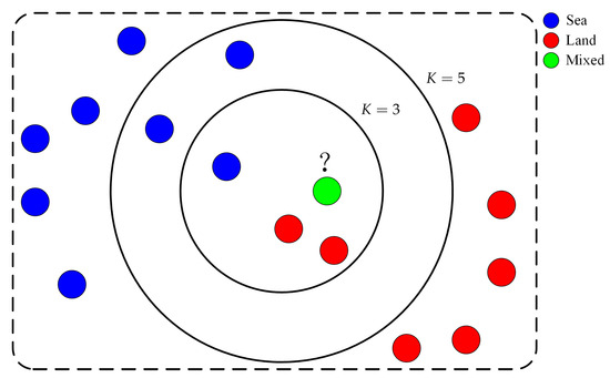 Let represent the SLCC results, and divide into a training set and a test set by classes. All of the nodes in the training set are represented as , which contains labeled sea clutter and land clutter. For each , the longitude is , and the latitude is . Similarly, all of the nodes in the test set are represented as , which contains labeled mixed clutter. For each , the longitude is and the latitude is . The KNN-MCC method consists of two steps: (1) we find the K nodes from the training set O which are closest to node , and (2) we vote on the classes of the K samples to subdivide the mixed clutter further into sea clutter or land clutter, as shown in Figure 6. Given the longitude and latitude of two nodes, the Haversine formula is used to calculate the distance between these two nodes [30], which is defined as follows: