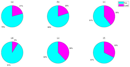 The proportion of sea and land in the electronic map. (a–f) represent the proportion of sea and land for Area-1 to Area-6, respectively.
