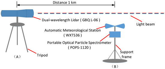Schematic diagram of the test equipment deployment. In the figure, (A) represents the dual-wavelength lidar, which is installed on the second-floor platform, and (B) represents the support frame, which holds both an automatic weather station and a particle spectrometer at a height of approximately 3 m above the ground. The horizontal distance between (A) and (B) is 1 km.