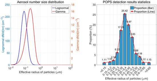 Comparison and statistical analysis of aerosol number size distributions. The left panel illustrates a comparison between the number size distributions based on the Gamma distribution and the lognormal distribution. In this panel, the horizontal axis represents the effective particle radius, while the vertical axis indicates the number size distribution. The blue and red curves correspond to the unimodal structures of the lognormal and Gamma distributions, respectively. The right panel shows the ratio of the number of particles within different size intervals to the total number of particles in the sample. The horizontal axis represents the particle effective radius intervals with a bin width of 0.05 μm. The vertical axis indicates the proportion of data points detected in each size interval relative to the total number of particle data points in the entire sample. In other words, all particle effective radii are first obtained by the particle spectrometer; these values are then grouped by the preset size intervals, and finally, the number of data points in each interval is divided by the total number of data points in the sample to yield the ratio. This ratio is presented in two formats: a histogram (light blue) and a line graph (red). The term “POPS” in the caption of the right figure refers to the Portable Optical Particle Spectrometer.