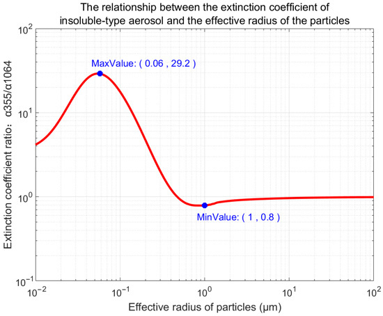As described in Section 1 of this study, the aerosol particle size range is between 0.01 μm and 100 μm. Accordingly, the range of effective particle radii selected for this study is between 0.01 μm and 100 μm. The complex refractive indices for the wavelengths 355 nm and 1064 nm can be obtained from the OPAC database, with both wavelengths having a refractive index of 1.53 − 0.008i. Based on the Mie scattering theory, the extinction efficiency factor () for a specified spectral distribution radius can be calculated for a given refractive index. By applying Equation (6), the extinction coefficient ratio for particle effective radii in the range of 0.01 μm to 100 μm can be derived, as shown in Figure 5.