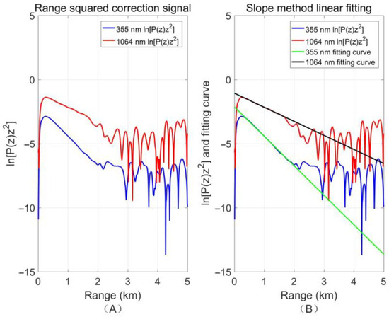 Equation (9) represents the calculation formula for the aerosol extinction coefficient. In this formula, the logarithm of the echo signal, after being corrected for the square of the range , is taken, followed by linear fitting. Half of the negative slope of the fitted curve corresponds to the measured aerosol extinction coefficient at the respective wavelength. This method is commonly referred to as the slope method.