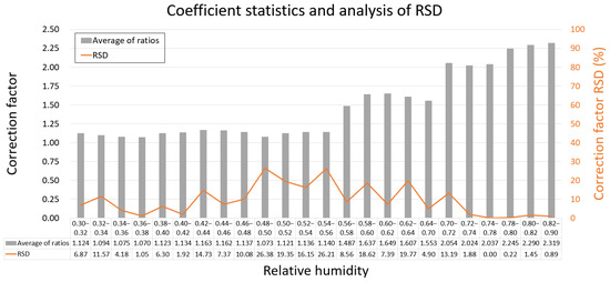 At the same time, the effective particle radius retrieved by the lidar and the effective particle radius detected by the particle spectrometer for the sample data are compared by calculating the ratio between the two, and the relationship between the ratio and the corresponding relative humidity is derived. It is observed from the data in the table that the relative humidity lies within the range of [0.30, 0.90]. This table represents process data for the analysis, and due to the large volume of data, we did not display them in the manuscript. The data are classified and statistically analyzed based on relative humidity intervals, and the average ratio of effective particle radii for each interval is calculated, as shown in the bar chart of Figure 7. Meanwhile, the relative standard deviation (RSD) of all ratios within each interval was calculated to visually reflect the fluctuation of ratios across different intervals. The results are shown by the line graph in Figure 7. For example, when the ambient relative humidity (RH) falls within the range of [0.30, 0.32], the mean ratio of effective particle radii detected by the lidar and the particle spectrometer is 1.124. Within this RH range, the RSD of all ratios is 6.87%.