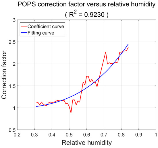 Analysis of Figure 7 was conducted by plotting the mean values of the ratios against relative humidity on the horizontal axis, with an exponential fitting applied as shown in Figure 8. The coefficient of determination (R2) for the fitted curve was 0.9230. This indicates that (1) a correlation exists between the effective particle radii detected by the lidar and the particle spectrometer in this study, and this correlation can be expressed by an exponential relationship; (2) the correlation is strong, with a coefficient of determination exceeding 0.92; (3) the results are consistent with the aerosol hygroscopic growth theory, providing robust scientific support. Therefore, the equation of this fitted curve can be referred to as the correction coefficient equation, expressed as follows:
