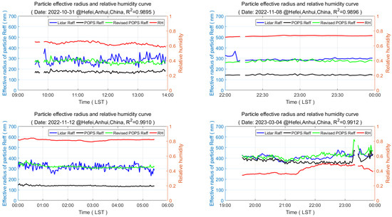 Correlation of effective particle radius from sample data. The blue line represents the effective particle radius retrieved by the dual-wavelength lidar, the black line represents the original effective particle radius detected by the particle spectrometer, the green line represents the corrected effective particle radius detected by the particle spectrometer, and the red line represents the ambient relative humidity. The R2 value in the title indicates the coefficient of determination between the effective particle radius retrieved by the lidar and the corrected effective particle radius detected by the particle spectrometer.