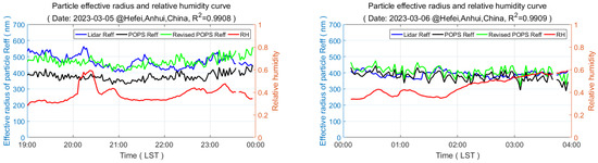 To further validate the accuracy and general applicability of the dual-wavelength lidar retrieval results, retrieval data beyond the sample data were analyzed. Specifically, the particle effective radius retrieved by the dual-wavelength lidar on 5 March 2023, 19:00–23:59, and 6 March 2023, 00:00–04:00 (hereinafter referred to as the “test data”) was compared with the particle effective radius from the particle spectrometer, which was corrected for relative humidity. The correction formulas remained unchanged and continued to use Equations (10) and (11). As shown in Figure 10, the coefficient of determination (R2) between the particle effective radius corrected by the particle spectrometer and the dual-wavelength lidar results for 5 March 2023, and 6 March 2023, were 0.9908 and 0.9909, respectively, both of which were greater than 0.99. These results not only demonstrate the general applicability of the verification method proposed in this study but also confirm that the dual-wavelength lidar retrievals of aerosol particle effective radius are accurate and reliable. Furthermore, these findings support the assumption made in Section 4.1, paragraph 2.