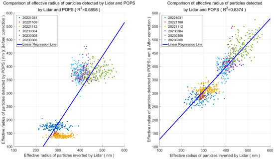 Combining both the sample and test data, Figure 11 presents the comparison of the particle effective radius retrieved by the dual-wavelength lidar with that detected by the particle spectrometer, including results before and after correction.