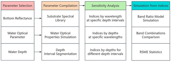 In OSW regions, the primary parameters influencing reflectance are derived from the RTE and include bottom reflectance, water optical properties, and water depth. These parameters are compiled into spectral datasets, including substrate spectral libraries, simulated water optical properties, and segmented depth intervals. Subsequently, sensitivity analysis is performed to assess the influence of these parameters across wavelengths and depths. Finally, depth inversion simulations are performed using the band ratio bathymetric model, and retrieval accuracy is evaluated by root mean square error (RMSE) statistics. This workflow, which integrates parameter selection, sensitivity analysis, and simulation, is illustrated in Figure 1.