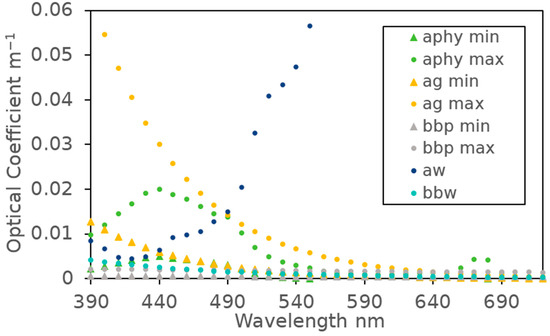 where at is the total absorption coefficient, aphy is the absorption coefficient due to chlorophyll, and ag is the CDOM absorption coefficient. The scattering coefficient b includes directional components; bf represents forward scattering, and bb represents backscatter, with units of m−1. Figure 2 shows IOP limits for typical clear oceanic waters over many years [39].
