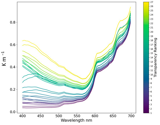 Attenuation coefficient spectra under various water quality conditions, with colors sorted by water transparency.