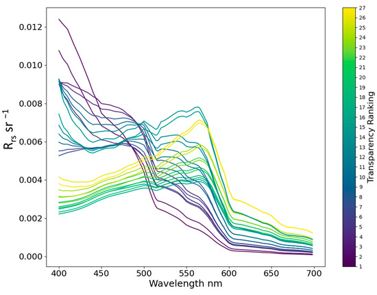 Figure 4 illustrates non-monotonic trends in deep-water reflectance across different wavelength bands as transparency decreases. Blue-green reflectance does not exhibit a monotonic relationship with transparency, whereas long wavelength reflectance increases as transparency decreases. In short wavelengths, the deep-water reflectance spectra present two typical clusters: one with decreasing reflectance across wavelengths and the other showing a peak in the yellow-green band. These two patterns correspond to typical Case 1 and Case 2 waters, where overall reflectance increases in more turbid Case 2 waters. These spectra closely align with findings from relevant water reflectance studies [44,45,46,47].