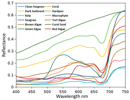 Opaque water bottoms, unlike atmospheric and water columns with certain transparency, exhibit simpler optical processes. Bottom reflectance represents the contribution of the substrate to the total remote sensing reflectance. Since direct measurements are challenging due to water coverage and attenuation [48], organizing a spectral library under controlled laboratory conditions can provide valuable references for related studies. Hydrolight, an optical water simulation software, includes a finite bathymetric model and a spectral library of measured bottom reflectance, as shown in Figure 5. In recording practices, bottom spectra are typically documented as surface reflectance, theoretically ranging from zero to one, and dimensionless. The water reflectance in Figure 4 is typically recorded as remote sensing reflectance, whose spherical integral corresponds to surface reflectance ρ. For Lambertian reflection at the bottom, the relationship between surface reflectance and remote sensing reflectance is as follows:
