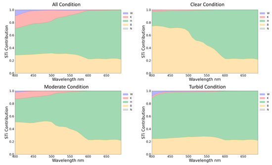 Parameter sensitivity contribution within the 0~10 m depth range under various water conditions. W, K, H, B, and N represent deep-water reflectance, water attenuation coefficient, water depth, bottom reflectance, and sensor noise, respectively.