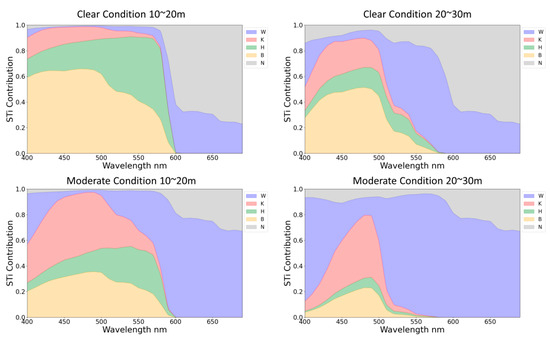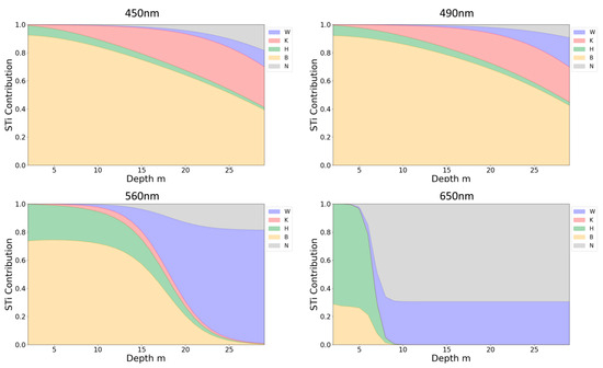 Figure 6 illustrates the full-order sensitivity index contribution (STi) ratio of each shallow water parameter across the 400~700 nm visible light band within the 0~10 m depth range under different water conditions. In the 0~10 m depth range, water depth and bottom reflectance are the primary contributors to the sensitivity of remote sensing reflectance. Remote sensing reflectance in short wavelengths exhibits higher sensitivity to bottom reflectance. In contrast, longer wavelengths, due to higher attenuation coefficients, exhibit higher sensitivity to variations within this depth range. Depth and bottom reflectance variations contribute approximately 40~70% and 20~30%, respectively, to the overall sensitivity.
