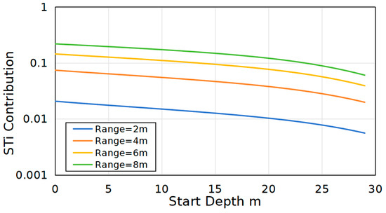 In the preceding paragraphs, Figure 6 and Figure 7 analyzed a water depth variation range of 10 m. Figure 8 illustrates the sensitivity contributions of various parameters across commonly used bands as water depth increases, based on a 4 m variation range. Figure 9 focuses on the commonly used 490 nm band, which exhibits relatively high penetration in clear water, and illustrates the sensitivity contribution of the depth parameter across variation ranges of 2, 4, 6, and 8 m. The optical parameters align with the clear water conditions listed in Table 2.