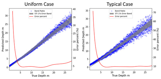 Figure 10 selects a sandy bottom and the clearest water conditions simulated earlier. Two typical cases are designed, one with a spectral variation of 2.5% considered a uniform case, where water quality and bottom variations are minimal. The other with a spectral variation of 25% considered a typical case, where a certain amount of dark biological bottom is present within the sandy environment, leading to noticeable changes in water color. The chosen band combinations are the commonly used blue and green bands in remote sensing, and the reflectance of the two bands is fitted using the band ratio formula in Equation (3) to derive the predicted water depth from the band ratio bathymetric model. Figure 10 also shows the depth variation range corresponding to 1% STi and the relative error at different depths. The absolute error of the bathymetric model increases with depth, rendering precise depth estimation more challenging as it nears optically deep water.