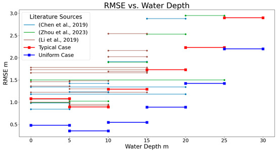 The OSW criteria require that the water depth be less than the water transparency. Maximum detectable water depths for remote sensing are equivalent to the transparency in the clearest natural waters, while for areas of research, the detection limit in oceanic coral reef areas is typically around 30 m [26,27,28]. In waters with lower transparency, depths of about 10 m are detectable [8,29,30,31,32], while rivers with depths under 3 m also offer a spatial scale suitable for remote sensing mapping [33,34,35]. When performing statistical analysis on remote sensing-derived water depth across the full depth range (e.g., 0–15 m or 0–30 m) in oceanic OSW areas, the RMSE is generally on the order of approximately 2 m. Further subdividing the depth range into smaller intervals reveals additional statistical characteristics of RMSE [7,14,36]. The following analysis first considers the error magnitude across the full depth range.