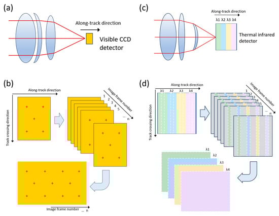 Schematic diagram of multispectral infrared camera imaging modes. (a) VIS imaging system, (b) Mosaic of VIS images, (c) TIR imaging system, and (d) Mosaic of TIR images from four spectral bands.