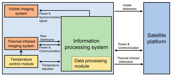 The VIS imaging system employed mature commercial lens modules to obtain the 400–700 nm band features of the landscape. It was designed with a spatial resolution of 60 m, enhancing the accuracy of geographic information positioning. On the other hand, the TIR imaging system was employed to acquire images in the MWIR and LWIR bands. It was primarily designed for wildfire detection applications on the Earth’s surface. The TIR imaging system could function independently of light conditions, maintaining operational competence during both diurnal and nocturnal periods. The information processing system included two components: a data processing component and a temperature control component. These modules facilitated the camera’s stable acquisition of remote sensing images and external measurement and control communications. The camera is capable of realizing 24 h of uninterrupted remote sensing observation, which improves the efficiency and time resolution of remote sensing data acquisition and ensures continuous and effective monitoring of the target area.