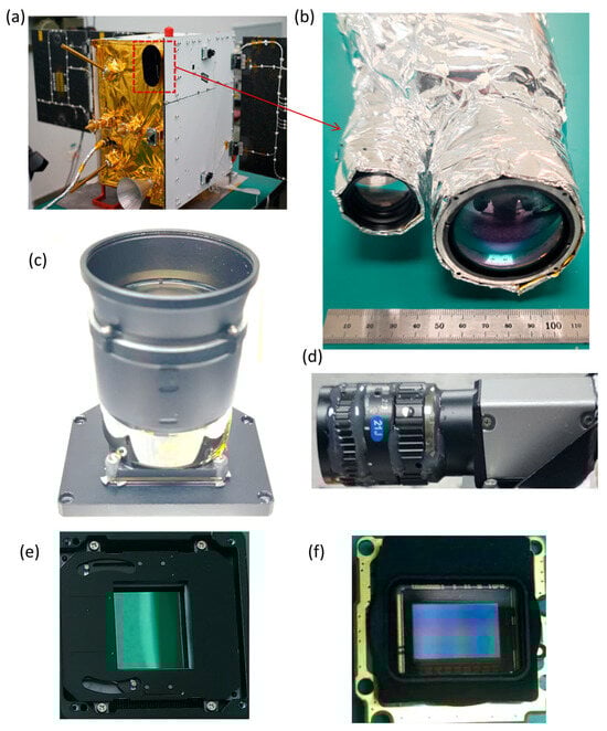 Camera appearance and components: (a) camera mounted on a 50 kg-class small satellite, (b) camera exterior with a thermal insulation layer on the outer envelope, (c) TIR optical system, (d) VIS optical system, (e) uncooled infrared detector, and (f) VIS detector.