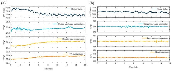 The radiation response–temperature change graph when using the accurate temperature control technique for the TIR imaging system. (a) Non-temperature controlled, and (b) temperature controlled.