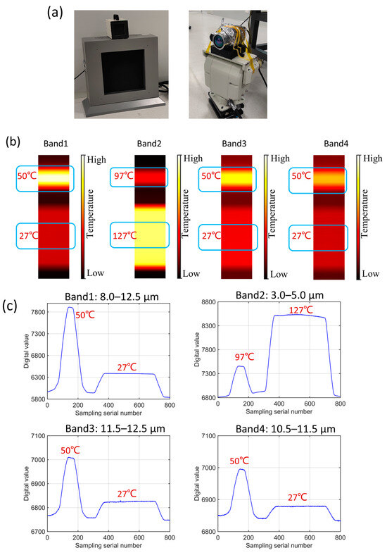 We conducted a NETD test on the four TIR spectral bands of the multispectral uncooled infrared camera. The procedure involved placing two standard blackbody sources (Model: Medium- and High-Temperature Blackbody from Optoelectronics Technology Co., Ltd., Jiyuan, Hangzhou, China) at different temperatures in front of the TIR imaging system (see Figure 7a). For the LWIR spectral bands, blackbody 1 was set to 50 °C, while blackbody 2 was set to 27 °C. In contrast, for the MWIR spectral band, blackbody 1 was configured to 97 °C, and blackbody 2 was set to 127 °C. After powering on the camera, we used the precision temperature control system to adjust the temperature of the infrared optical lens barrel and the housing connected to the uncooled detector to approximately 1.5 °C above room temperature. Following a stabilization period of about 20 min, during which time the temperature gradually stabilized, we captured images of the two blackbody sources by the camera, and we selected the image area corresponding to the maximum response for each spectral band from the data acquired by the TIR imaging system of the camera, as illustrated in Figure 7b. The average curve of the response values from the two blackbody sources, acquired simultaneously along the traversing rail for the four bands, is shown in Figure 7c.