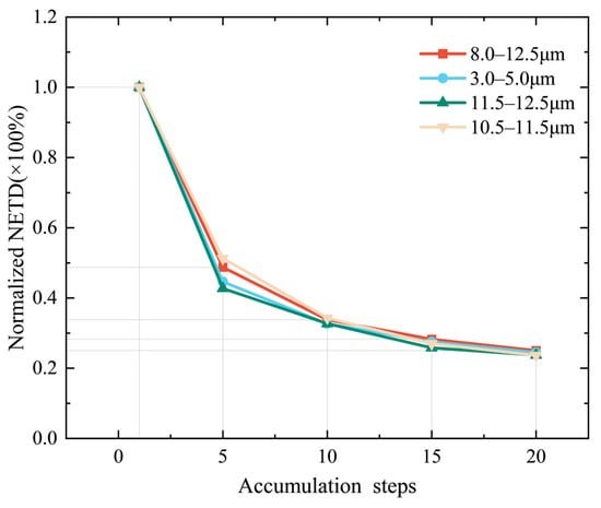 We drew the data in the above table into a graph, as shown in Figure 8 below. Compared with the accumulation series of 1, the NETD value of the accumulation series of 10 was about 30%, which was in line with the analysis of the enhancement capability of the Formula (9). Therefore, the system selected 10 times of accumulation when considering the operation resources comprehensively.
